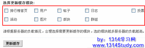 选择更新缓存模块:请根据服务器的负载情况,合理选择需要更新缓存的模块,选的模块越多服务器的负载越高。