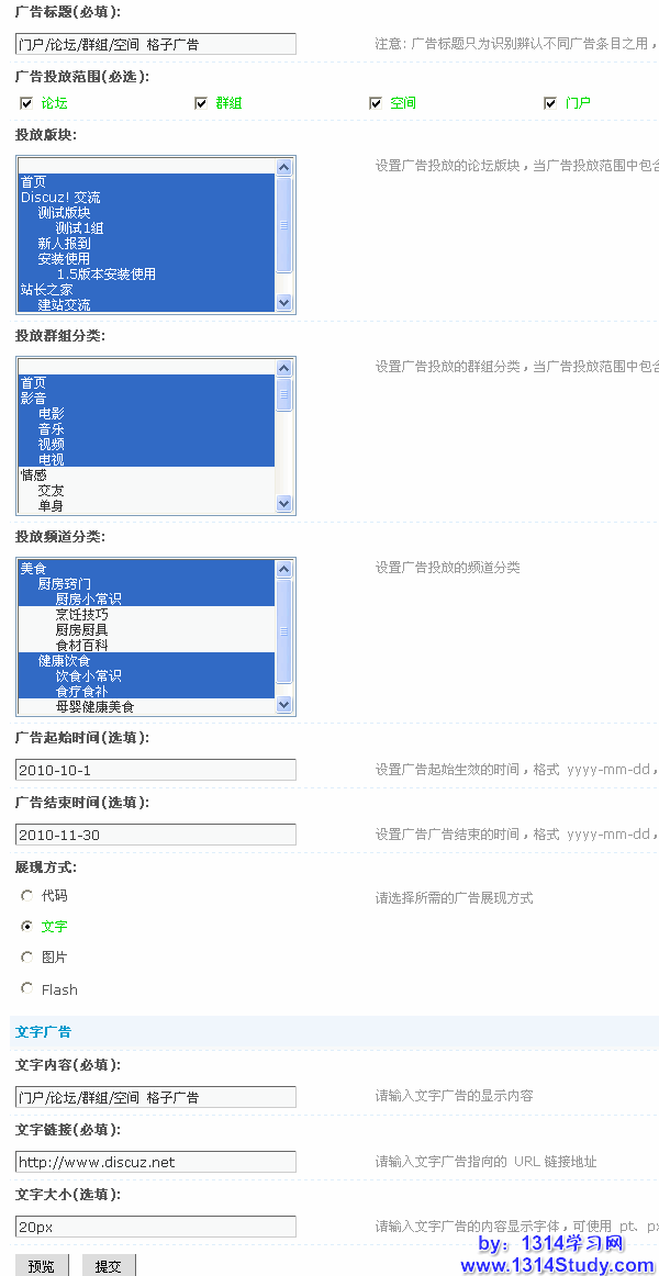 投放群组分类:这里可以不选择,因为前面的广告投放范围只选择了论坛,所在在群组中不会显示,如果上面的广告投放范围选择了群组,这里可以选择群组的分类。