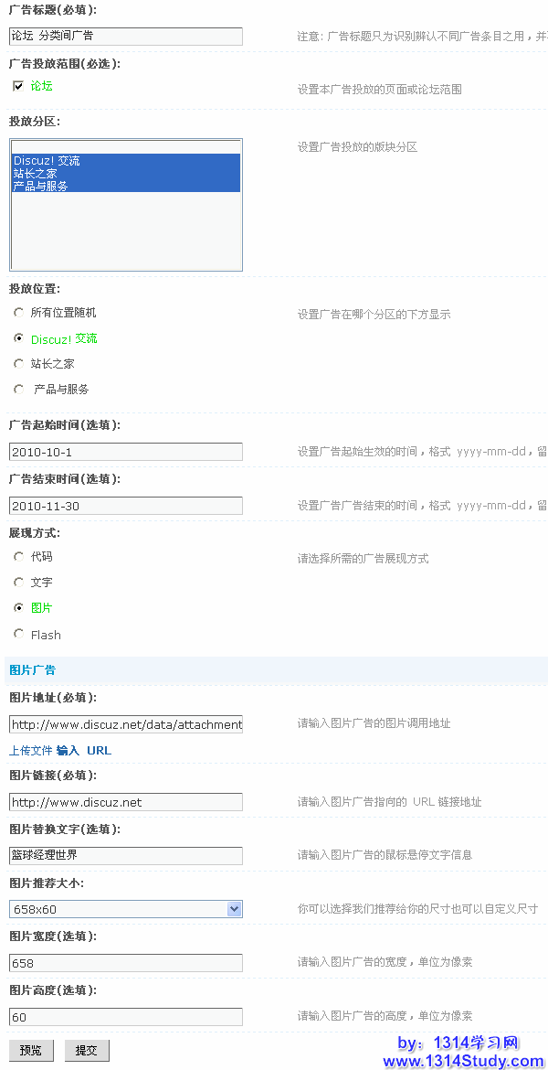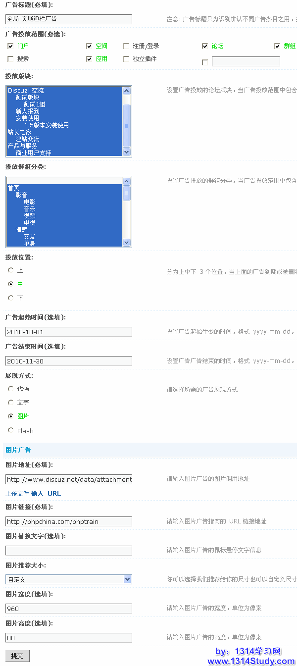 站长可以自由选择添加任何一种形式的广告位,选择之后再进行设置即可。在运营中需要注意的是,不同的广告位有其不同的展现方式和价值体现,比如全局页头通栏广告最大的特点是醒目,能让用户在打开页面的第一时间看到,适合做品牌的推广;而论坛/群组的帖内广告、门户文章列表广告等则适合特定内容的推广,不但能引起用户对广告内容的关注,还能增加网站PV等。每种广告位的展现方式和价值分析都可在后台功能处查看,Discuz! x1.5贴心为站长分析了最佳的广告投放方案。