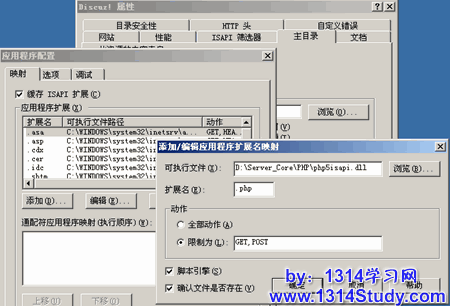 在站点属性窗口中,单击“主目录”页签,单击“配置”按钮,在新弹出的“应用程序配置”对话框中,单击“添加”按钮,加入PHP的ISAPI支持,选择可执行文件:X:\Server_Core\PHP\php5isapi.dll、扩展名为.php、限制动作为:GET,POST。单击“确定”添加,并在“应用程序配置”窗口中查看.php扩展是否加载成功。若成功,则单击“确定”关闭配置窗口,回到站点属性主窗口。