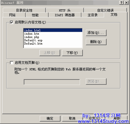 单击“文档”页签,在默认内容文档中添加index.htm、index.html、index.php三个文件,并将所有默认文档排序,顺序按照下图所示。完成后,单击“确定”,关闭站点属性配置窗口,回到IIS管理器主界面。