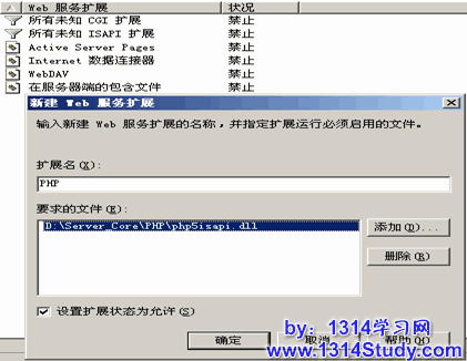 在如下图所示的“新建WEB服务扩展”对话框中,“扩展名”填写PHP,“文件”选择X:\Server_Core\PHP\php5isapi.dll,并设置该PHP扩展默认为允许。