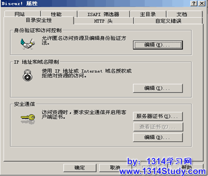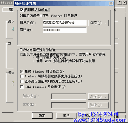 点击“身份验证和访问控制”框内的“编辑”按钮,浏览选择web用户,填上密码web,确认后,确定退出。