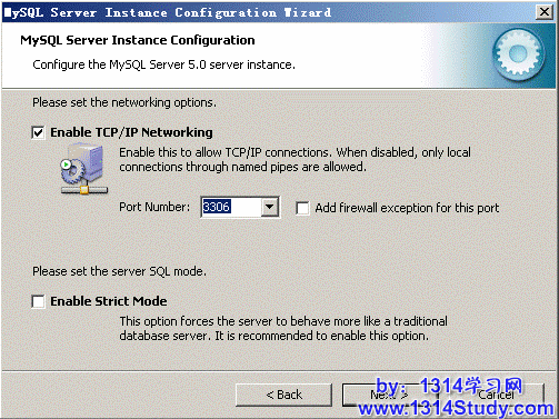 设定MySQL网络参数,注意:不要启用Strict Mode!那个Add firewall的选项仅在需要外连MySQL的时候勾选上,也就是说给防火墙加个出入站的策略。